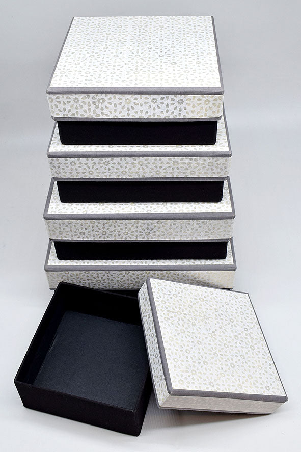 Fabric Clad Square Gift Boxes with White Block Print Lid, Gray